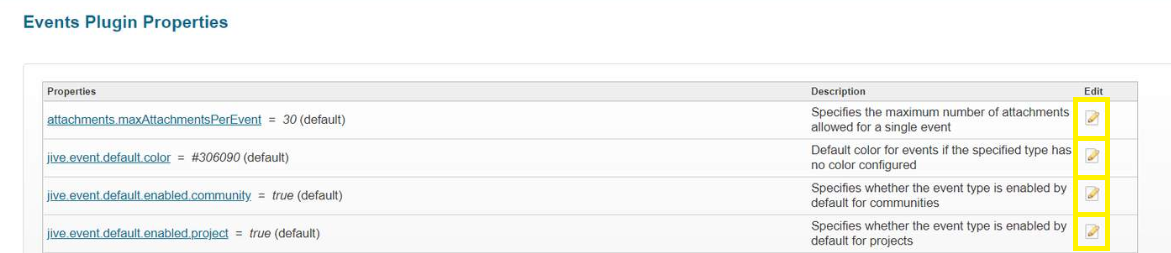 To edit event properties, go to Admin Console > Events. This leads you to the page, Event Settings > General. To edit a property, click the pencil icon at the end of its row.
