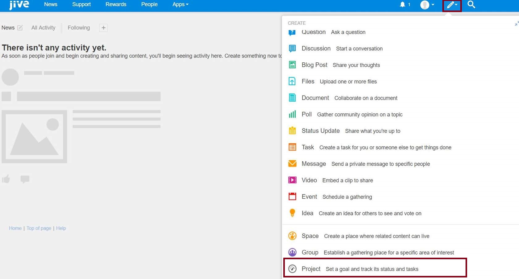 We do not recommend you to use widgets and widgetized Overview pages in your community. For more information, see Understanding pages in places. - Once the project is created you can add tasks to it. For more information, see Creating tasks.