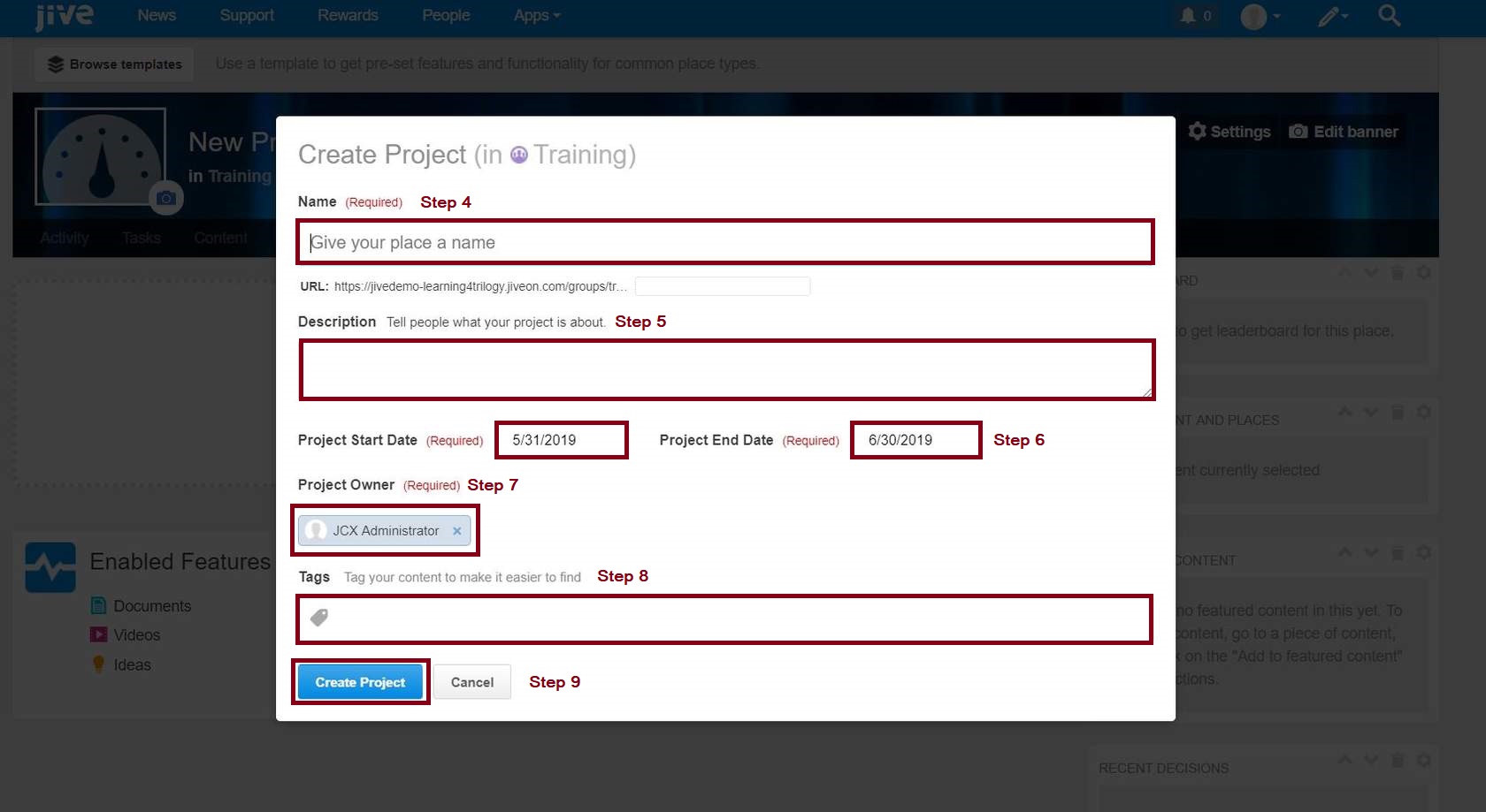 Projects are associated with a place, such as a space or a group. The place you choose determines who can see and collaborate on the project. - In Name, specify an identifying name for the project.