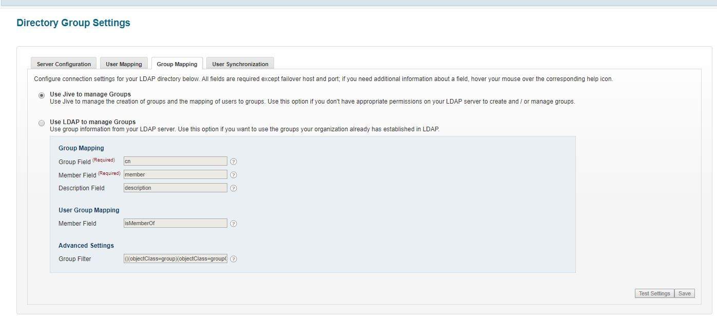 If you are provisioning users from a directory server, you can maintain permission groups in Jive or use your LDAP permission groups. This article provides information on using the Group Mapping tab to determine which information LDAP and Jive will share and how they will keep group information synchronized.